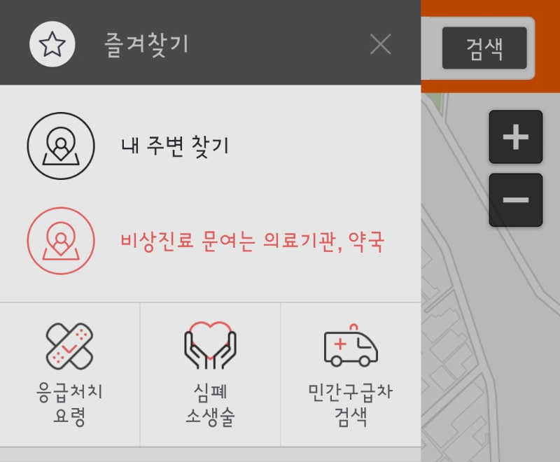 어플의 왼쪽 상단에 삼선을 누르면 응급처치요령, 심폐소생술, 민간구급차 검색, 진료 병원 응급실 조건 등의 정보도 확인할 수 있네요. 그런데 현재는 비상진료 문 여는 의료기관, 약국 버튼(빨간색)은 활성화되지 않네요. 저건 아마도 연휴가 시작되는 9일부터 활성화되지 싶습니다.